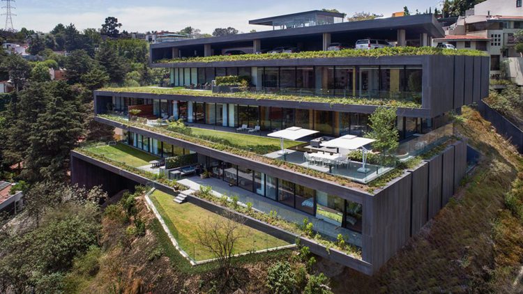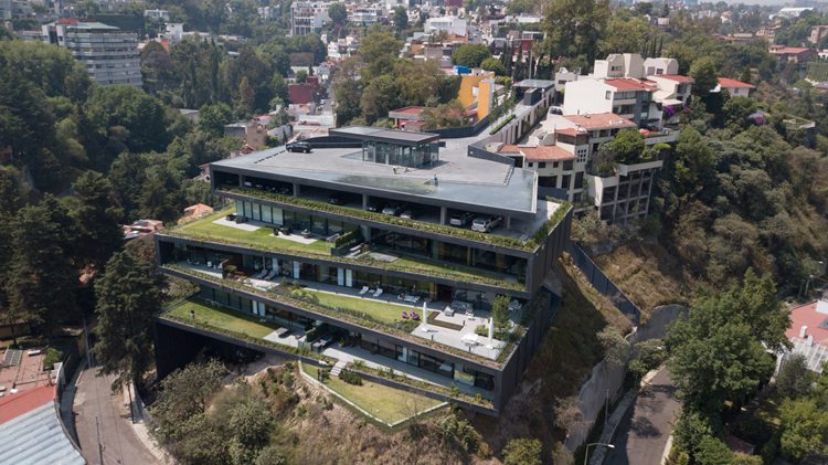 项目位于墨西哥城,是一座豪华住宅楼。黑色的瓷质墙面环绕着巨大的窗户和花园,由Sordo Madaleno事务所设计的该建筑坐落在山上,俯瞰下方的城市。三层玻璃立面建筑的一层和二层分别是住宅和休闲设施,模拟所在的山坡地势,比三层稍微突出。设计师表示,由于处在多山环境中,我们希望建筑尽可能融入所属环境。