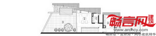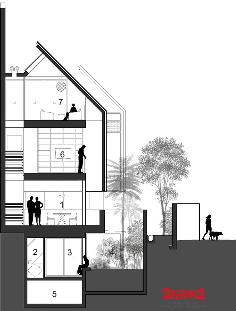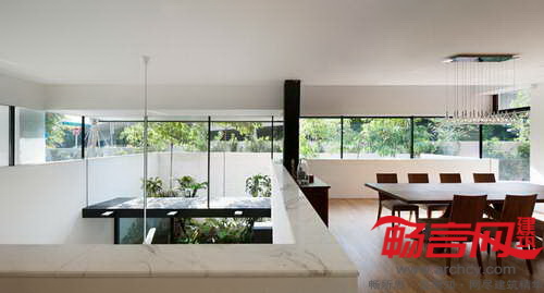 设计师给出的解决方案是使用四块折板真正将外界干扰隔开,并维护室内空间的私密性。住宅带有一个地沉式的花园,给主要生活区提供了宜人的植被。