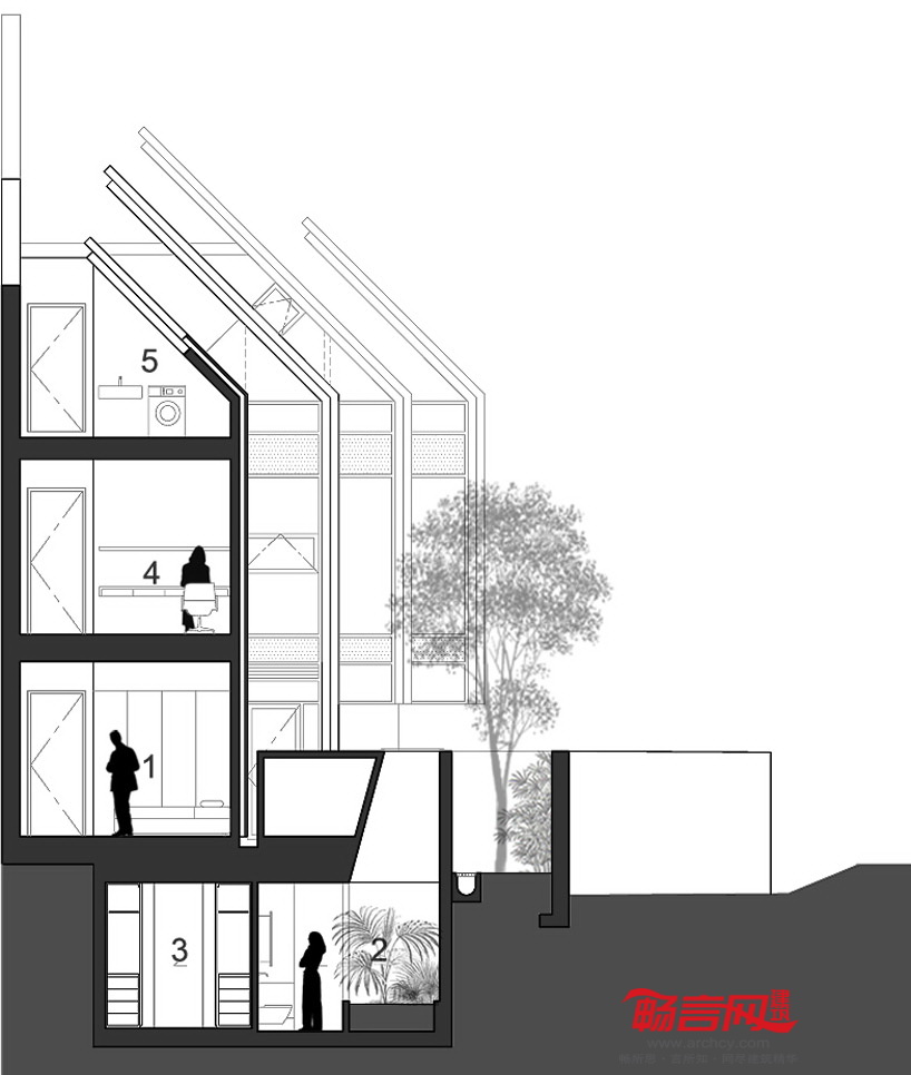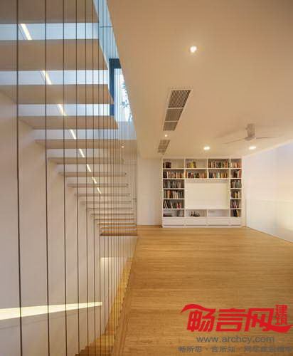 阁楼的机械风扇起到了烟囱效应,将建筑低层的凉爽空气带到上层的卧室。