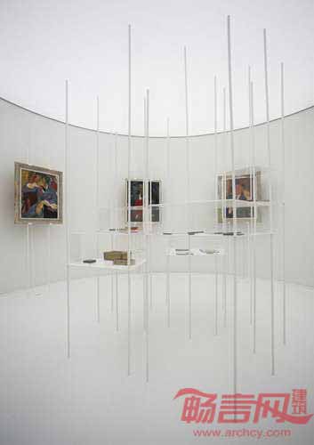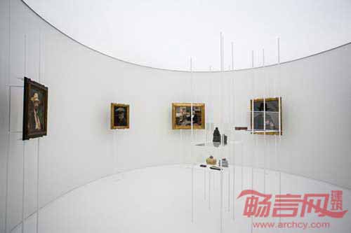 各个空间均采用顶上照明,以避免不必要的阴影,艺术品或印刷品通过结构设施悬挂,而没有安装在墙上。