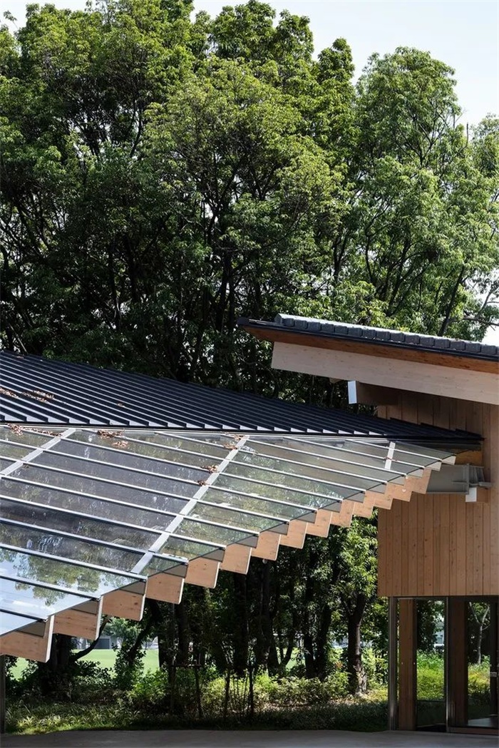 瓦片集成型太阳能电池、透明太阳能电池和绿色屋顶与多面体屋顶融为一体,将不同的环保技术附着在屋顶的不同侧面,赋予屋顶不同的表现形式。建筑采用了 Kaneka 的多项环保技术。例如,在这些中型建筑中采用了 Kaneka 为独立式住宅开发的木结构外绝缘和双重通风方法,安装了根据室外气温改变通风路径的系统。