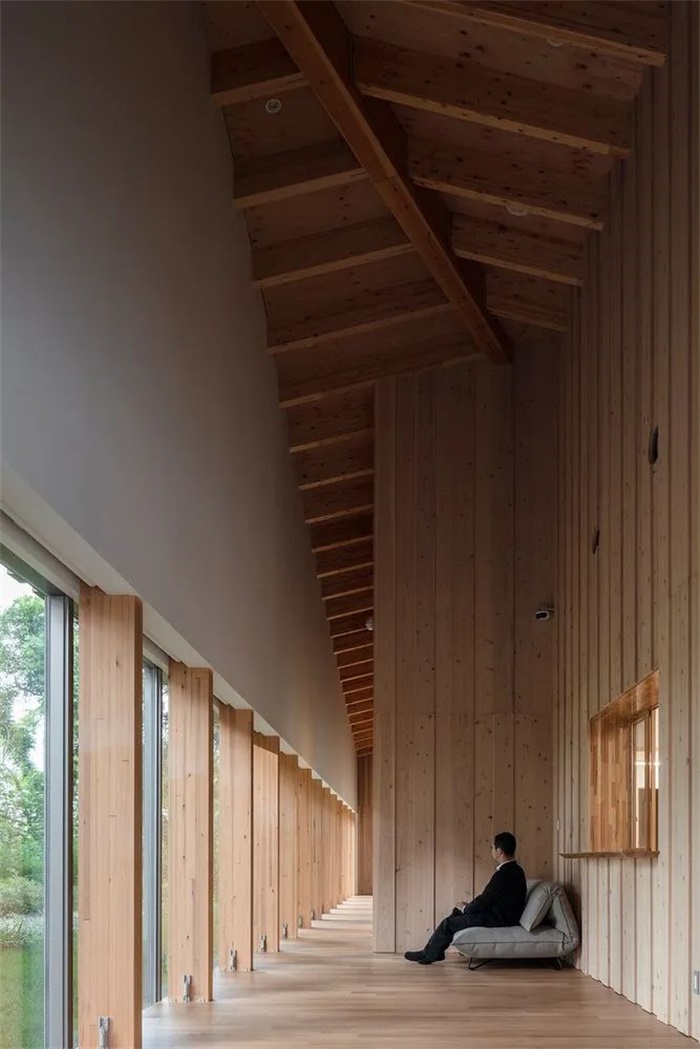在对现有树木进行 3D 扫描以创建数据从而确定其位置后,砍伐了树木(主要是外来入侵树种),以保留适合该地区的树种。从地面延伸的多面体屋顶覆盖着建筑,使建筑与森林融为一体。
