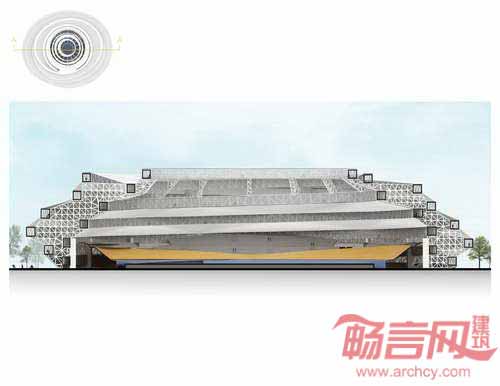 设计方案是一个螺旋上升的坡道形式,场馆设计目的是使建筑在城市文脉中能代表Sinaloa州的竞争主义精神。目前,世界范围内室内自行车场馆外部大多都是大型停车场。对于以汽车侧重汽车使用的场馆设计理念,设计师做出了回应——将体育场馆和河畔公园完美融合起来。