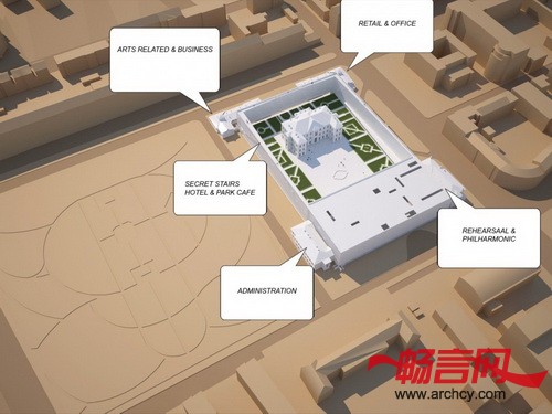 Atelier Thomas Pucher为该项目提供了最佳的解决方案,它既满足了管弦乐队对高质量的演出场地的需要,又尊重了原有的历史性建筑。建筑师为整个建筑添加了一座浮墙,这样既告诉了人们这里有一个童话般的公园,而这个建筑是这里的新中心,同时又提供了一个绝对的安静场所,只是管弦乐队演出的最基本环境要求,这样会有演出氛围。而公园成为了一个开放的公共场所,而浮墙和音乐厅则都是它的陪衬,但是却为它锦上添花。