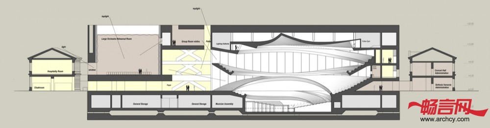 音乐大厅是鞋盒子大厅和竞技场建筑的融合体。传统的鞋盒子大厅有很好的声音效果,但是视觉效果却不佳,而竞技场则恰恰相反,它有好的视觉效果但是声音效果却很差。