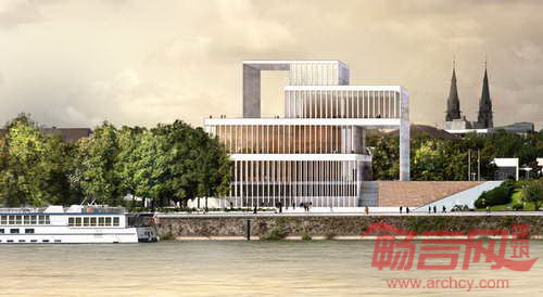 David Chipperfield建筑事务所提交的方案中,四个玻璃立方体出现在莱茵河畔,细高的支柱支撑起建筑悬挑结构。游人可以经过莱茵漫步道进入音乐厅一层,楼上二层或者顶层露台。建筑设计考虑到城市历史,建筑师表示,“历史上首次通过建筑使场地显示出独特的战略重要性。”