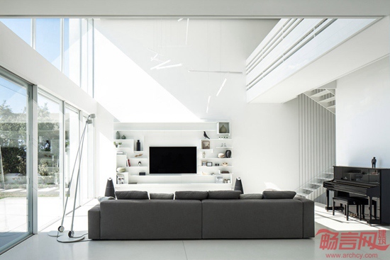 Pitsou Kedem建筑事务所设计了一座海边住宅。建筑二层采用悬挑结构,突出伸向地中海方向。外立面设有水平凹槽,勾勒出美观的阴影。业主夫妇有三个孩子,委托设计师为其位于以色列北部村庄Shavei Tzion,临近业主位于工业区的厂房。场地距离大海仅有70米,之间有一块灌木林。项目设计希望凸显房屋同海洋形象和声音之间的联系。