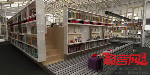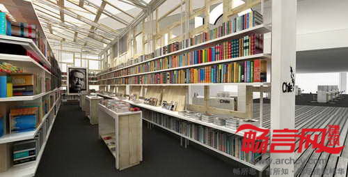 场馆包含了两层表皮——由木质窗体构成的通透外层,以及展览图书构成的临时二层表皮,同时为内部(书脊)和外部(纸张)增添了色彩。场馆内部实质上是个巨大的图书馆,涵盖了书展区、公共区和演讲台,能够同时用于休闲阅读区。