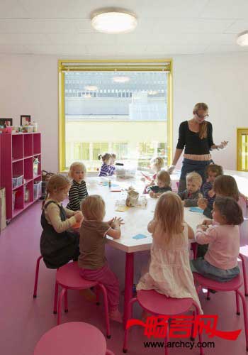 在参观过Reggio Emilia学校之后,托儿所的拥有者和教师们得到了设计这个别致建筑的灵感 —— 不是循规蹈矩的设计一个将各年龄段的儿童分别开来、让他们在不同的教室里学习、活动的建筑,而是在托儿所里设计了一个宽大的活动空间,让六个年龄段的儿童在一起玩耍、交流和学习。除了这个大空间之外,托儿所里还设有几个单独的艺术、戏水、午睡和进行安静活动的房间。