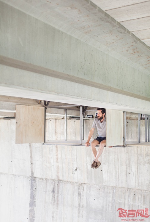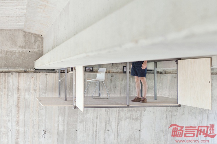 自学成才的设计师Fernando Abellanas在西班牙巴伦西亚一座遍布涂鸦的立交桥下方创造了一个悬挂的工作室,让混凝土桥梁成为其住所的屋面和墙面。设计师完成了家具和灯具的设计,仅花费了两周时间,就完成了这一木材和金属框架的项目。他不想透露具体位置,不过表示自己经常得到在受忽略的空间中做设计的机会。
