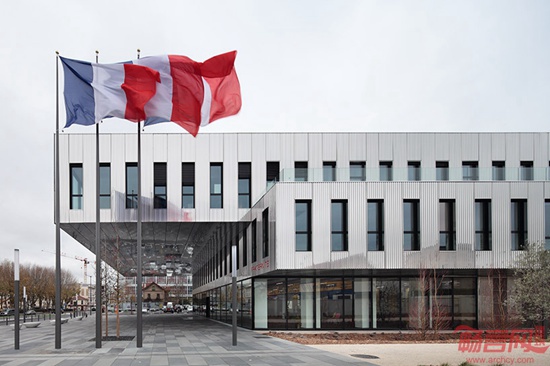 ECDM建筑事务所完成了法国巴黎郊区Bezons市政厅设计。项目面对道路采用缩进处理,最明显特点是醒目的悬挑结构,营造出下方具有遮盖的公共空间。人们从塞纳河畔来到建筑前方,会被其标志性的外观所吸引。建筑构成地区振兴计划的一部分,该计划涵盖一系列新建商业和住宅设施。