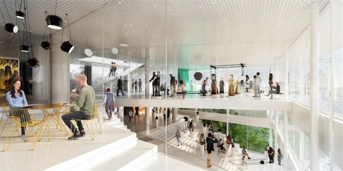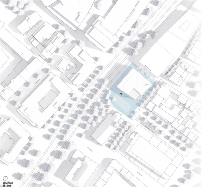 在广场层,一个宽敞的入口楼梯将建筑与公共空间连接在一起。上方的美食区为建筑物和开放空间之间的进一步过渡区域,并邀请人们留在户外。上层的密集排布有利于下层的退进,创造了更多具有吸引力的公共空间。新建筑与对面教堂形成强烈张力场,也造就了广场的独特气质。