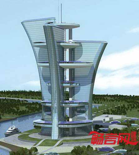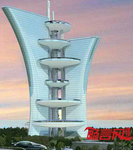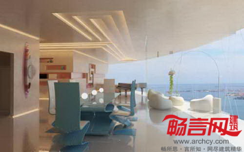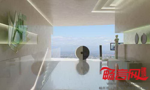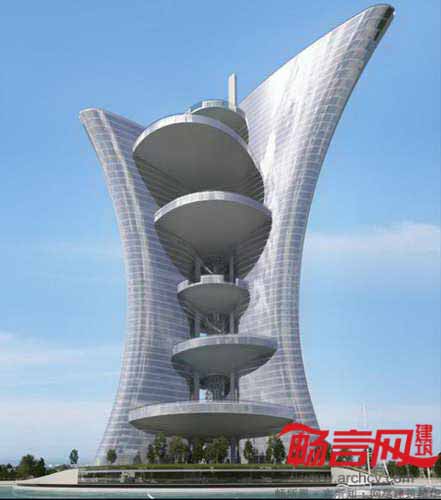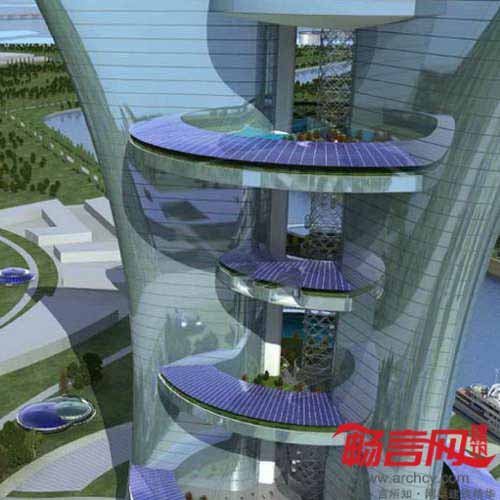高层平台上将设泳池、花园和池塘,而建筑顶层设有直升机升落台。