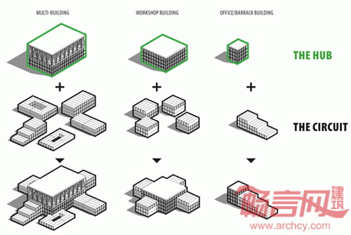 丹麦Adept建筑事务所赢得了一项设计竞赛的优胜,被丹麦军方委托设计兵营建筑。该项目名为“绿色环形道”包含可移动设施,能依照使用要求,自由地嵌入墙面。Adept建筑事务所同当地Nord Arkitekter公司、Cowi工程公司以及GHB景观设计事务所合作,共同完成位于丹麦奥尔堡现有兵营场地中的三座军队建筑。建筑均为永久性设施,均配有一系列嵌入性结构。不同墙面可以增减一套元件,依照政治性改变,配合临时使用功能。设计师表示,“我们希望将建筑、景观和经济作为灵活的实体考虑,这种思路潜力无限。”