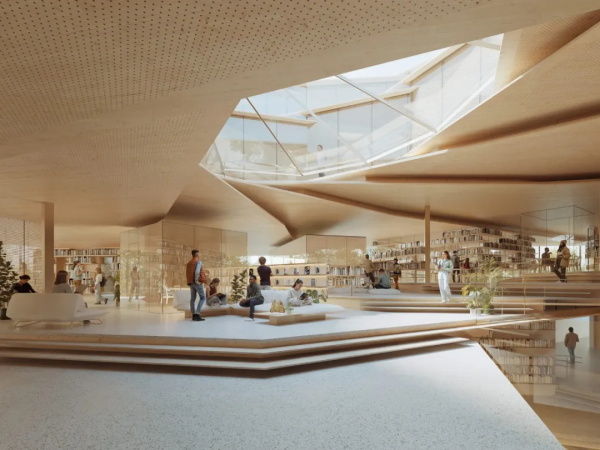 由隈研吾建筑都市设计事务所(Kengo Kuma & Associates)设计的“Vortex of Words”公共图书馆项目位于波兰东南部城市Rzeszow。。建筑总建筑面积约18,961平方米,规划为地上5层、地下1层。项目不仅包含传统图书馆阅读与藏书功能,还整合音乐厅、多功能厅、会议空间与展览区域,形成集阅读、教育与文化活动于一体的公共文化建筑。建筑同时承担城市公共空间的角色,通过开放广场与屋顶露台连接周边街区。