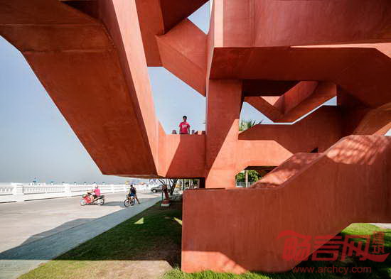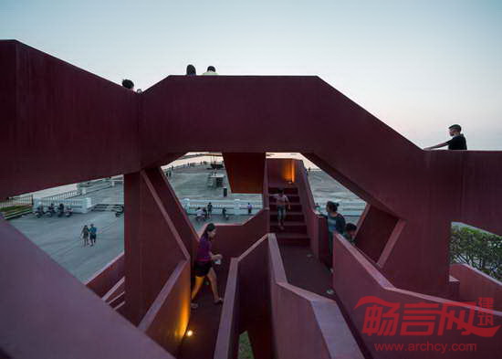 Supermachine工作室为泰国Bang Saen海滩设计了“迷宫”楼梯观景台。项目位于曼谷以东60英里,坐落于一个海滩度假胜地中。项目是混凝土材料、相互连接的红色楼梯装置。游客可以在楼梯上玩躲藏游戏。