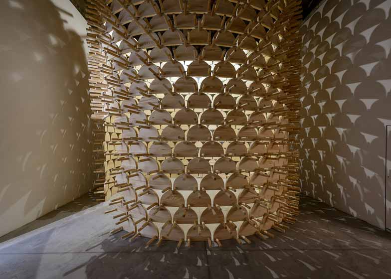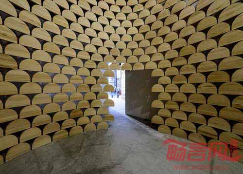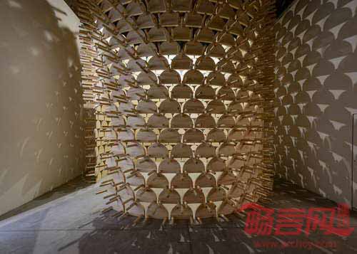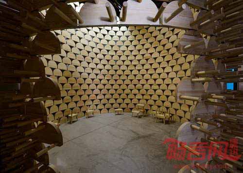 来到威尼斯双年展科索沃馆的游客首先看到的是一个由692个木凳组成的钉状环形高塔。本届双年展主策展人类目·库哈斯设立了“吸收现代性”的国家馆主题,要求各个国家馆设计反映过去百年中的建筑变化。科索沃馆策展人Gezim Pacarizi关注点在于现代主义如何同科索沃政治动荡产生联系。该馆主题是“可见性:强加的现代主义”,展览展现了从20世纪初期开始,国家如何从自治秩序朝向集权主义的转变,毁坏家园,为大型现代建筑结构腾出空间。