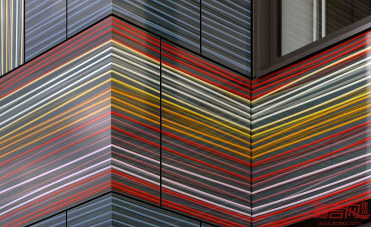 NPS Tchoban Voss事务所设计了德国柏林Tuchfabrik办公楼。这是一家服装制造公司,如今展现了赋有吸引力的新鲜面貌。进入建筑前,访客可以从外立面领略到建筑历史。建筑师运用数字打印面板,其图案令人联想到以前大厦的用途。紧密交织的线条闪闪发光,不同颜色凸显在黑灰背景下,如同对历史的颂歌。
