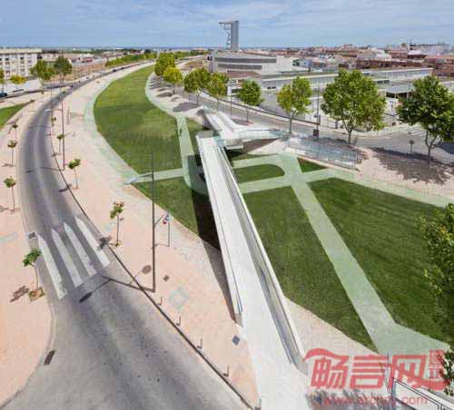 巴伦西亚Salvador Ivorra一道雨水渠上架起了一座新桥,桥梁有一个浪漫的名字——亲吻桥,指的是桥梁的两部分轻柔相接。水渠两侧各有一种不同的跨越方法,形成了别具一格的边界形式。