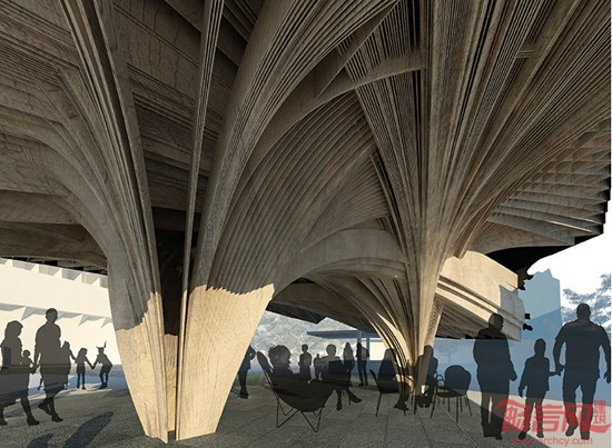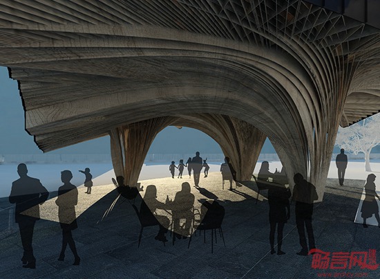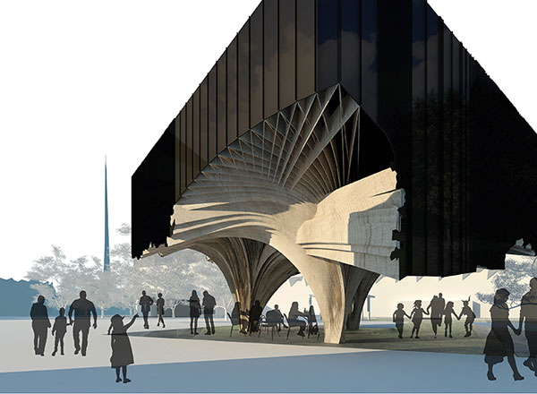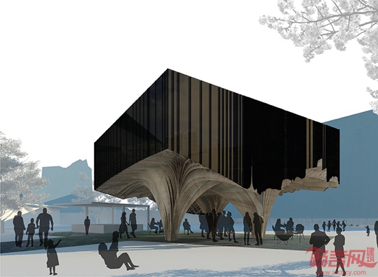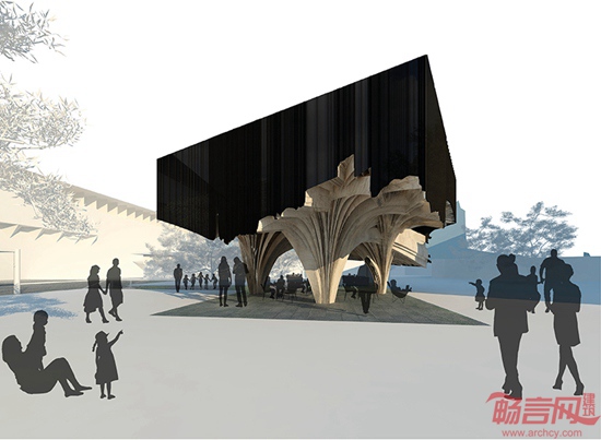 NAAU工作室运用地理学特点塑造维多利亚国家美术馆雕塑公园建筑外形。方案将城市构想成档案馆,可将任何一个建筑构想定时存储起来。花园场馆积极地考虑了场地特点,而非将其视作被动的背景。设计主要因素之一是墨尔本数据追踪系统,在场馆上方的方体结构上得到了体现。