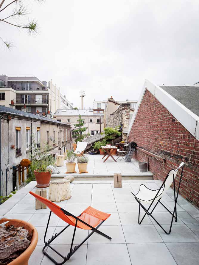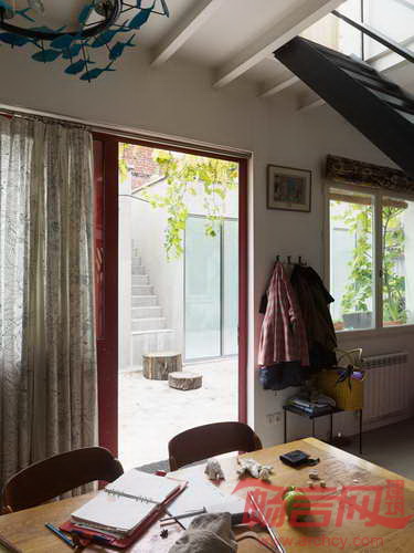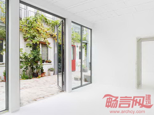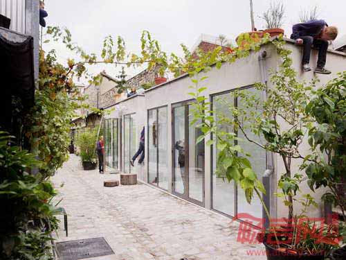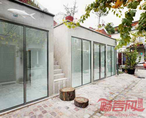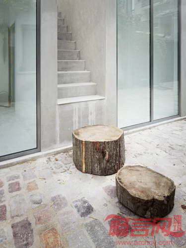 项目位于法国巴黎郊区,邻近一个跳蚤市场区域。所在街道一侧是住宅楼,一侧是艺术家工作室。业主委托设计方对其两个工作室进行重建,优化其空间。设计师创造了两个独立、却又有联系的工作室空间,赋予其充足的光照、高天花板和户外露台。两个22平米的房间严格对称,内部相连,围绕在一个户外楼梯周围。出于舒适性和私密性考虑,楼梯不会到达小巷水平面,楼梯前设置了两个树桩。楼梯下方是两个工作室的连接区域,容纳了厕所和大水池。项目建造采用了低调实用的材料。主混凝土剧诶够采用现场施工。露台添加的水泥板,未设置扶手。空间内部的地板、墙面和天花全部刷成白色,使室内光线非常充足,外立面未作表面处理。