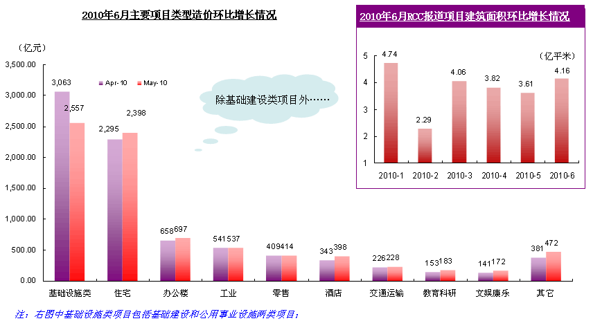 专业工程信息咨询公司RCC的月度项目监控报告显示,在2010年6月RCC所报道的工程项目(除基础建设及公用事业设施以外)建筑面积为4.16亿平方米,项目总造价达到了8,057.3亿元。与上月对比来看,除基础设施类项目造价出现了一定的下滑之外,其它主要类型的工程项目造价均有不同幅度的增长。