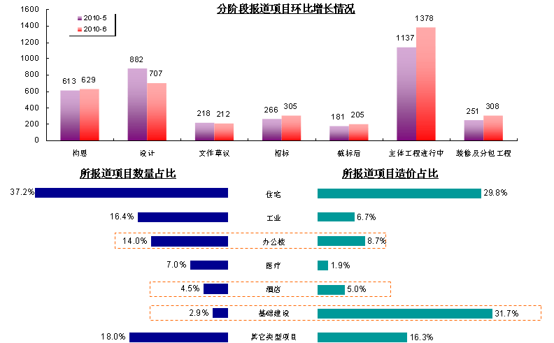 RCC数据监测系统显示:与去年同期相比,分项目阶段来看,6月份处于招标、截标后以及装修分包工程的项目数量有小幅度减少,而处于其它阶段的项目报道量均有一定的增长,尤其是处于构思和设计阶段的项目,这也说明新一轮的投资热潮正在酝酿之中;与此同时,本月所报道的基础设施类项目造价占总造价的31.7%,造价已超过住宅项目排名榜首。