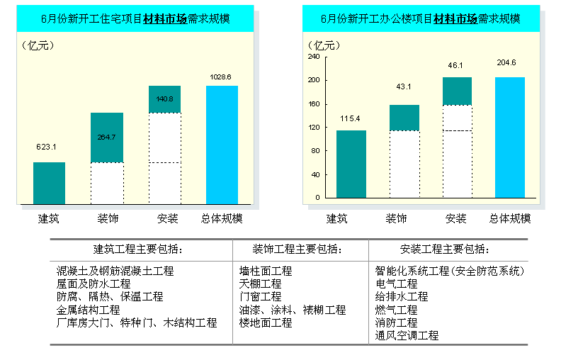 2010年6月,住宅类新开工项目造价较上月有小幅度下滑,而办公楼项目造价则出现了一定幅度的增长。根据RCC“工程市场规模测算模型”的计算结果,本月新开工的住宅类项目预计会带动的下游材料需求规模在人民币1,028.6亿元,新开工的办公楼项目预计会带动的下游材料需求规模在人民币204.6亿元(均不含人工费)。