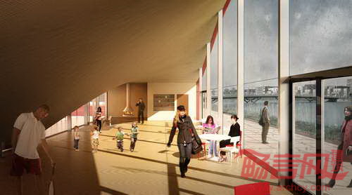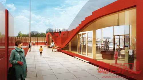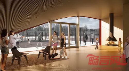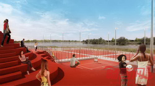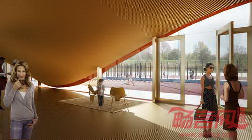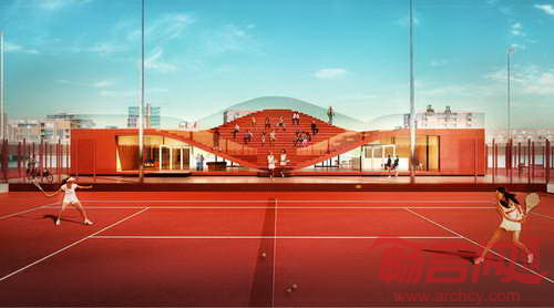 荷兰MVRDV建筑事务所为阿姆斯特丹东部的Ijburg人工岛建造网球场的方案获得了规划批准。除了为200名观众提供座位外,Couch网球场还包含新的更衣室、厨房和储存设施。设计方案旨在使网球场成为不同年龄层人群的聚集场所,全年365天向公众开放。项目的内部空间将取代先前的设施,其多功能区域将满足不同活动的举办要求。悠长的建筑正面是透明玻璃设计,网球馆自然光线充足,在室内可以欣赏湖泊的优美景观。场馆外部保温材料采用EPDM聚合物,材质和色彩与红色粘土网球场地一致。