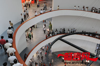 游客可以从公园的四个深红色入口进入这座3万平米的博物馆。在正方形馆博物馆的中心,有一个圆形中庭,这里有到达楼上三层展馆的入口。这三个展馆的圆形看台逐层向外扩大,形成一个倒立的金字塔形。而对游客来说,在观展时,他们仿若漂浮在博物馆里一样。