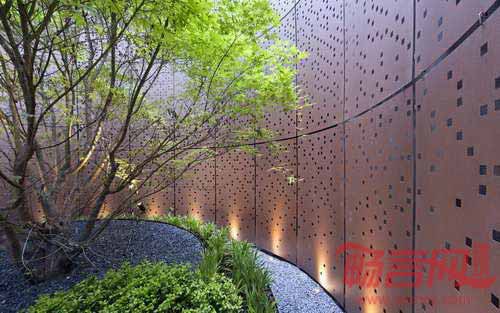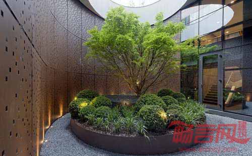 Unipol总部大楼位于意大利博洛尼亚,项目涵盖了1万平米建筑面积,旨在对区和城市之间核心地带进行重新开发。项目公共绿化区域委托给Frassinagodiciotto De Castelli公司,该公司负责完成墙面、配件和金属设施的制造。项目的核心元素是中庭,这一环形空间吸引了大众的视线,聚集了人群,其中最引人注目的是中央的一棵大树。弯曲墙面材质是抛光钢板,其表面利用激光切割创建了方孔图形,从上至下,穿孔取得了视觉密度的协调。室外绿化植物种植在耐候刚容器内,周边是低矮的绿色灌木。