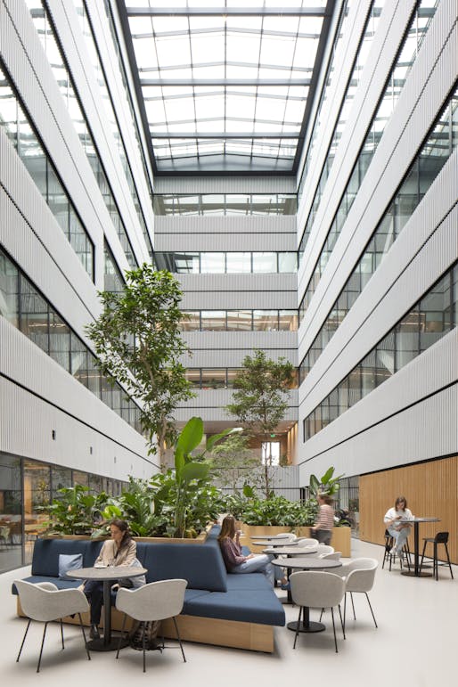 由MVRDV设计的Matrix ONE实验办公楼位于阿姆斯特丹科技园的中心,现在已经落成并投入使用。作为矩阵创新中心的主要枢纽,这座六层、面积达13000平方米的新建筑为园区创造出关键的社交空间和设施。更加重要的是,该项目还推动了可持续设计的发展:从可拆卸的建筑、“社交楼梯”、太阳能发电到智能照明和设有大量的自行车位的停车场,项目的设计从各个可能的角度融合了可持续的思想。Matrix ONE大楼实现了阿姆斯特丹雄心勃勃的能源使用目标,并获得了BREAAM优异评级。同时,大楼的使用者也是可持续性研究领域的先驱者,其中阿姆斯特丹大学的可持续实验室就坐落于此,他们将在这栋大楼中继续开拓可持续性研究的未来。