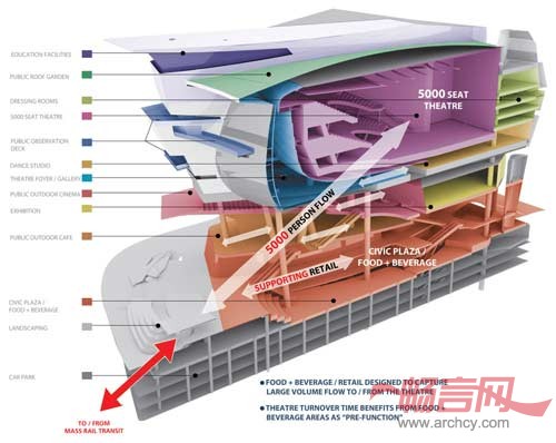 该建筑是公开的、大众的有机体,是人们可以随意进出的综合建筑。建筑内设一系列斜路、电梯、阳台和公园。所有流通的内部结构都很柔软弯曲,好像代表大众活动的优雅,但外部结构却又很结实。柔软度从公开零售店到隐秘的戏剧院成垂直变化。整个流通结构在空间上和“大厅”相连,通过剧院主要大厅的玻璃地面和下陷的商店相连,并会展示出上方的大部分结构。