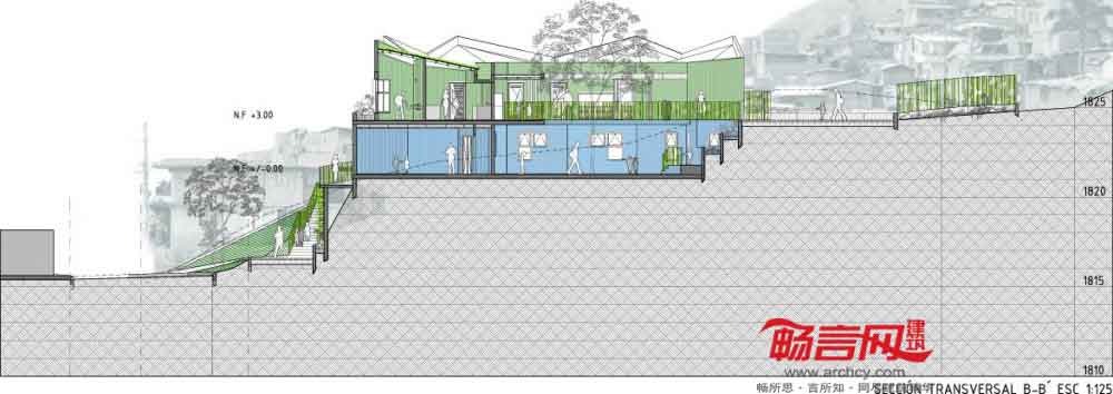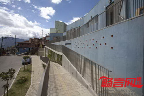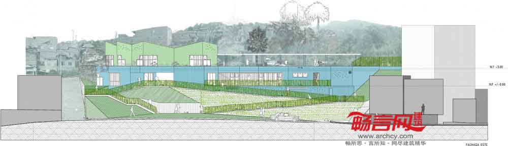 Santo Domingo街区的建筑一般是自建型红砖房——带有混凝土平屋顶,可以自由向上增建。随着时光的推移,该地区建筑不断增高,而以往的红砖外形也被灰浆和五颜六色的涂饰层取代。设计师希望项目方案能体现地区建筑高度的变迁,材料方面,使用了不规则和多样性的几何形状、蓝绿色花岗岩,期待建筑能够有较高的识别度,同时与街区的风格相吻合。
