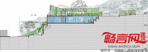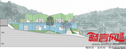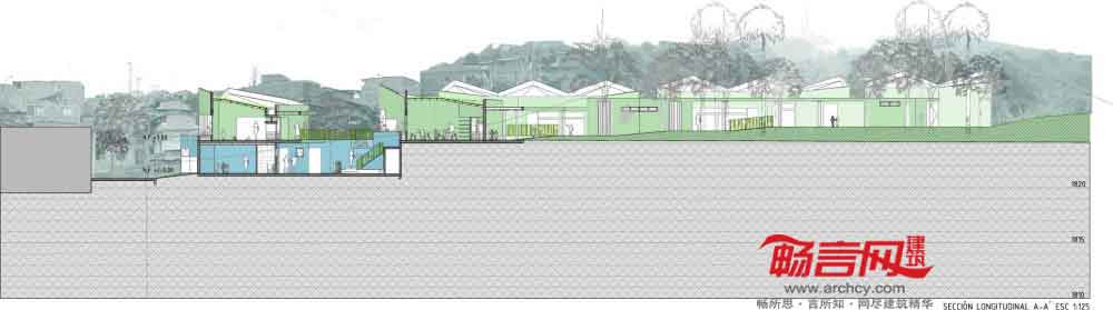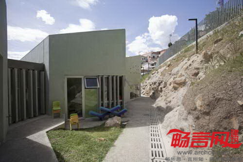 项目位于一个坡度为22%的石坡上,设计方案运用了模块化手法,从而适应了起伏的地形,避免了岩石爆破的昂贵费用。项目由两个模块层次组成,之间通过覆盖坡道连通。设计师试图避免拆除现有建筑,使幼儿园和周围街区紧密联系起来。