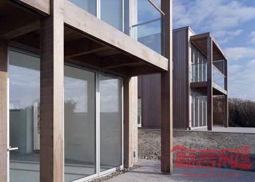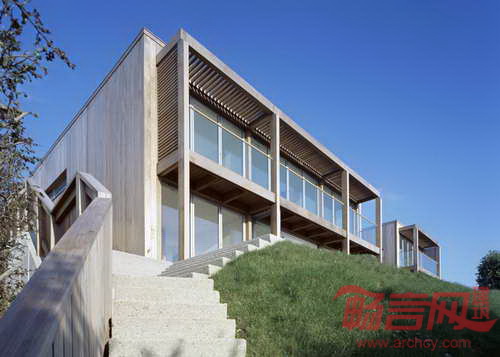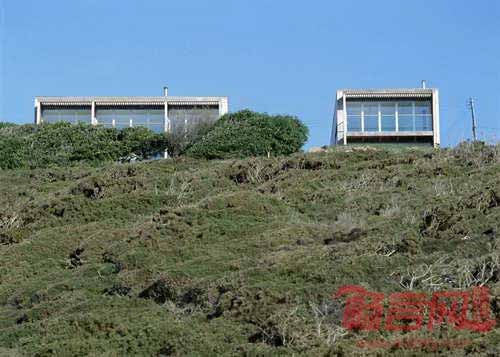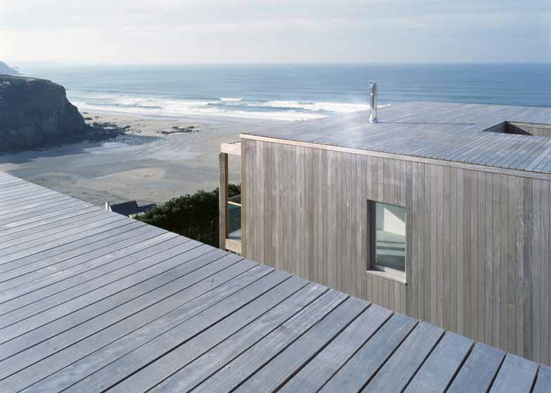 Simon Conder设计公司在英国港口小镇Porthtowan的一处陡峭的山坡山谷设计了两栋木屋。业主委托建筑事务所设计移动家庭住宅以及画家工作室和客房。项目所在场地俯瞰Cornish海滩,风景优美。为了营造建筑所需空间,项目移除了两栋现有建筑。项目部分空间位于山体下方,不会阻碍视野。项目顺应坡地地形,营造了面向道路的一层,其上两层拥有朝向大海的视野。南面的大玻璃窗为房间带来充足光线。门廊的设置有助于减少夏天的暑气。