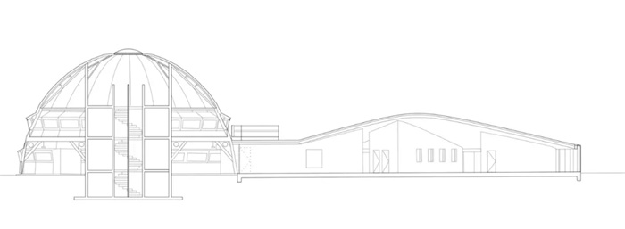 展馆采用传统建筑材料及技术建造。外墙采用深红色的砖砌成,内墙是一堵混凝土柱的砌块墙。开口有两种类型:(1)圆柱形玻璃幕墙;(2)嵌入式砖墙中的门和方窗。地板为抛光混凝土板。屋顶采用沥青屋面覆盖的木结构框架系统。