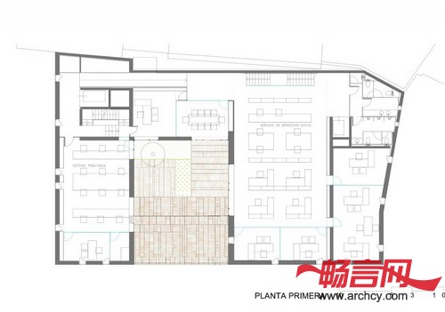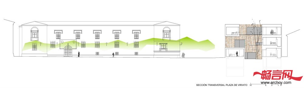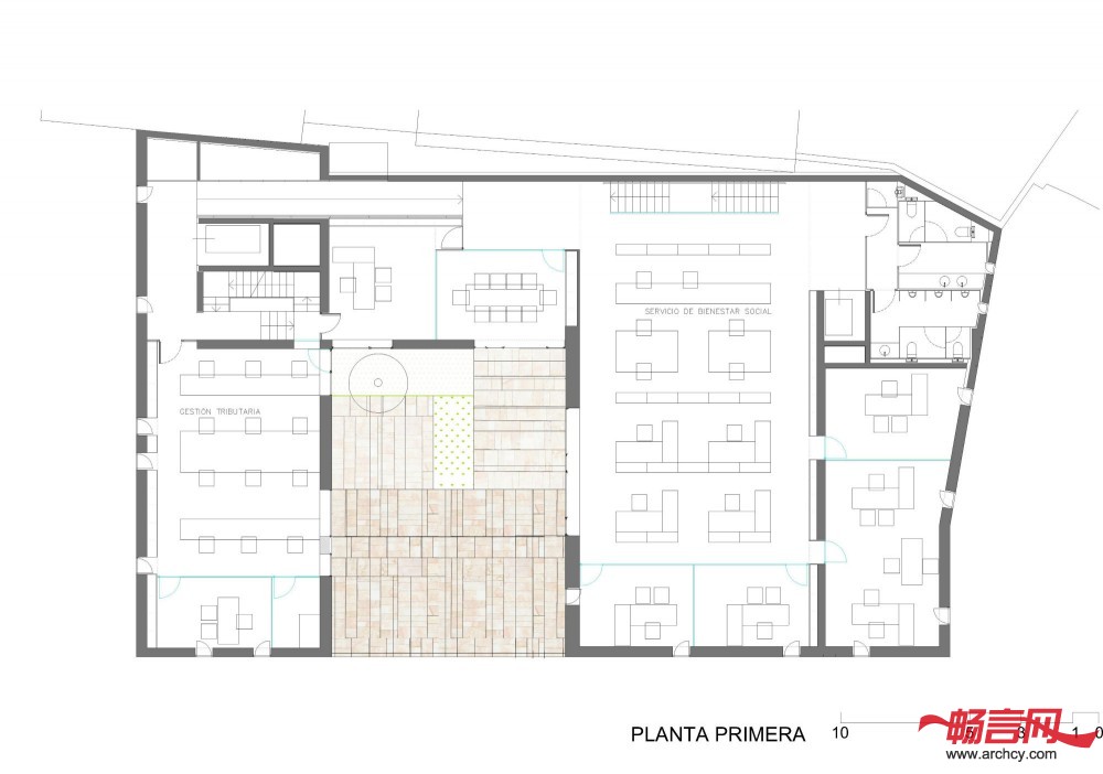 庭院在朝向广场的一侧有一个大开口,这样,办公楼就与Viriato广场连接起来了。人们可以从一楼来到这里,它也是办公楼的另一个公共阳台。