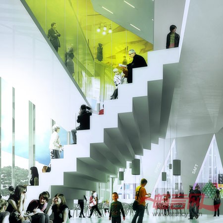 健康、文化、休闲和教育融合在一起,创造了一个令人惊叹的目标建筑形式。文化活动中心的主体建筑是一座长方形的玻璃建筑,其中包括6个堆叠的理想化个体元素。