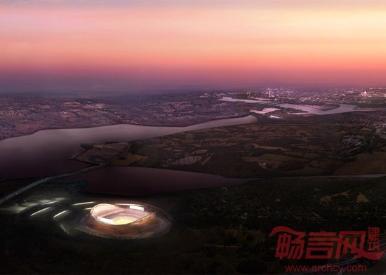 这座有6万坐席的场馆由金色金属网包裹,整体金属网结构呈波动曲面,将场馆的入口与出口处凸显出来。