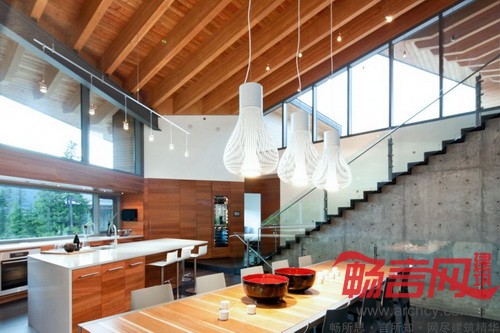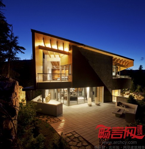 “业主来自英国伦敦,他们酷爱Whistler地区的木质建筑风格,但是他们又不喜欢那种‘一刀切’的建筑结构,他们希望房屋的格局能够体现独特的美感,”设计师说:“这座房子处在一个狭小却非常显眼的位置。为了保证私密性,我们将房子的大部分功能区域都安排在了底层。”