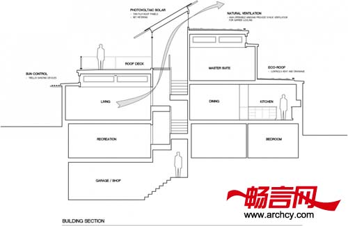 住宅的节能设计包括喷雾聚氨酯泡沫保温设施、一个高效率、低排放的、用于地板辐射采暖系的统燃气冷凝锅炉、一个空气对空气热交换器通风系统、天然草垛通风系统、PEX水暖管道(更好的保温性、更短的管道长度)和使室内自然光线最优化的天窗等等。位于屋顶的、带有净计量的太阳能电池管可以为住宅供电。此外,住宅还使用了许多可再生材料。