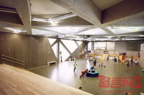 建造系统和材料:中心部分采用就地灌筑混凝土。建筑蓄热量相当大,设计最大程度降低春季和初夏季节降温的需求。建筑的力学设计和自然通风得到了结合。所有房间都有充足日照。儿童教室朝南,面向露天游玩区域。预制混凝土用于包含三角窗户的墙面,由于三角形玻璃窗直接塞入混凝土墙面,工程的精确度很高。