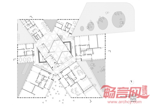 幼儿园布局呈现出六角星形状,设计师希望避免狭长走廊,并营造有序的户外院墙和街道空间。建筑位于场地一角,南侧预留出用于儿童玩耍的区域。