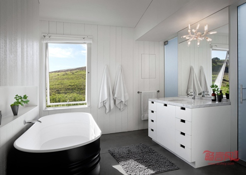 建筑师用钜好的雪松板包住房子外墙,并涂上白漆,房顶为人字形屋顶。房子建筑面积为232平方米,内设3间卧室。