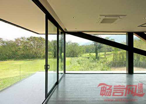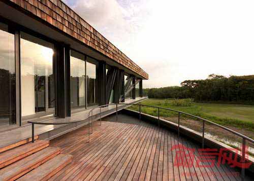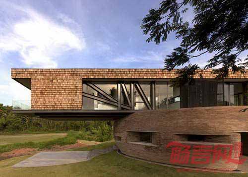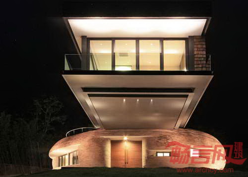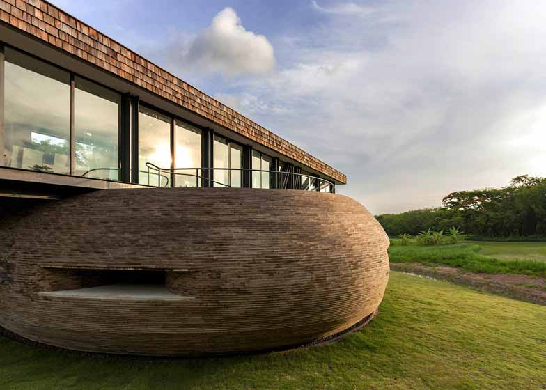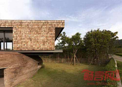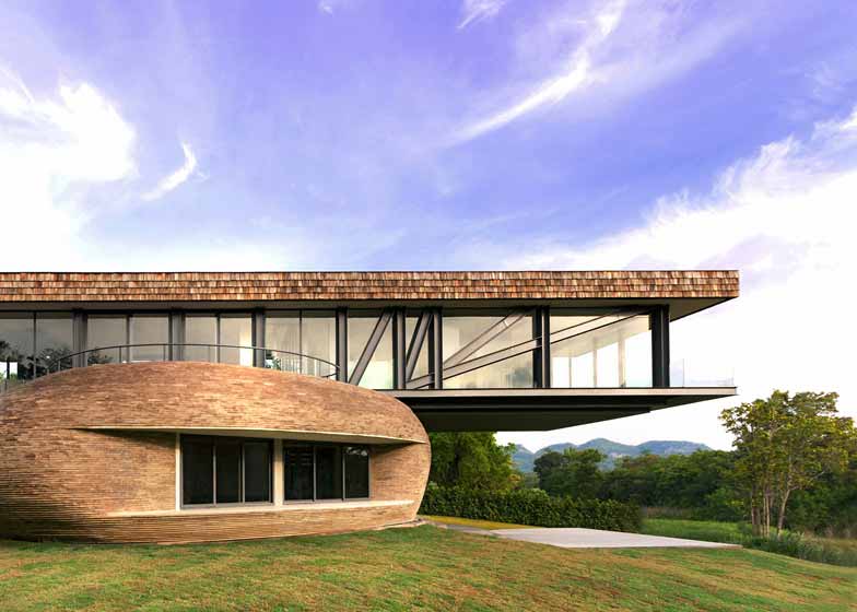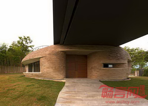 Architectkidd设计的这栋住宅位于泰国曼谷以东的Khao Yai,椭圆形的一层如同被矩形二层挤压,造型十分特别。设计师表示,“住宅所在的开阔场地和水平景观使我们重新思考传统建筑的建造方式。”二层顶部铺设了木质墙板,其中一侧突出距离较大。建筑一层外立面是当地土法制作的砖块,堆砌方式形成了曲面墙壁。墙面水平方向开辟了窗户,向内呈弧形的砖块与窗框实现了融合。