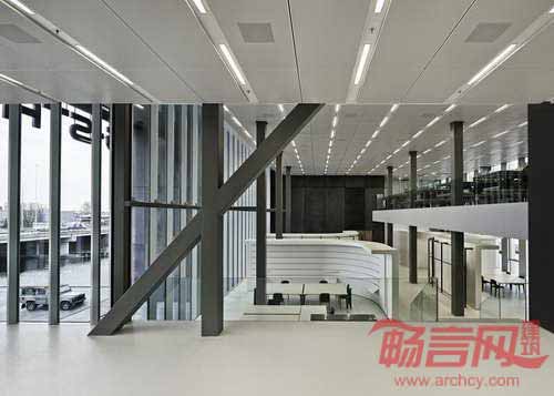荷兰OMA大都会建筑事务所设计了牛仔服装品牌G-Star Raw阿姆斯特丹总部。项目包含混凝土外壳、玻璃核心和仿佛飞机库的立面。项目坐落于Zuidoost工业区A10公路一侧,设计借鉴了业主品牌的军事化美学品味,运用了深色冷峻的材料以及庞大的体量。建筑长度达到140米,位于基座之上的建筑高于道路平面。建筑外层被黑色混凝土框架包裹,内部容纳了承重设施,室内区域中央设有一列玻璃柜,陈列了品牌创造性产品。