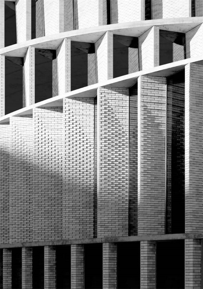 建筑设计呈圆润紧凑的外形,立面覆盖大量的浅色砖块, 它们排成一排,形成了一个独特的纹理网格。