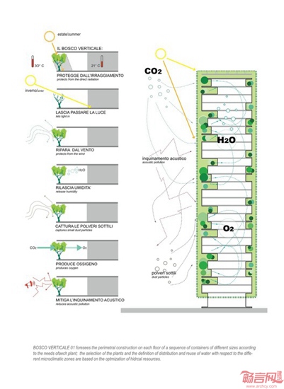 Bosco Verticale住宅楼位于意大利米兰,由Boeri工作室设计。建筑是“垂直森林”的首个项目,于2014年10月动工,属于一个大型改造计划的一部分。项目包含两座建筑,分别是80和112米,容纳了若干乔木、植物和灌木。项目墙面采用变化多端的色彩,挑战了传统的建筑材料。仿生建筑师依赖植物屏障,创造了适应项目特点的微环境和过滤光线,突破了环境可持续性设计手法的局限。