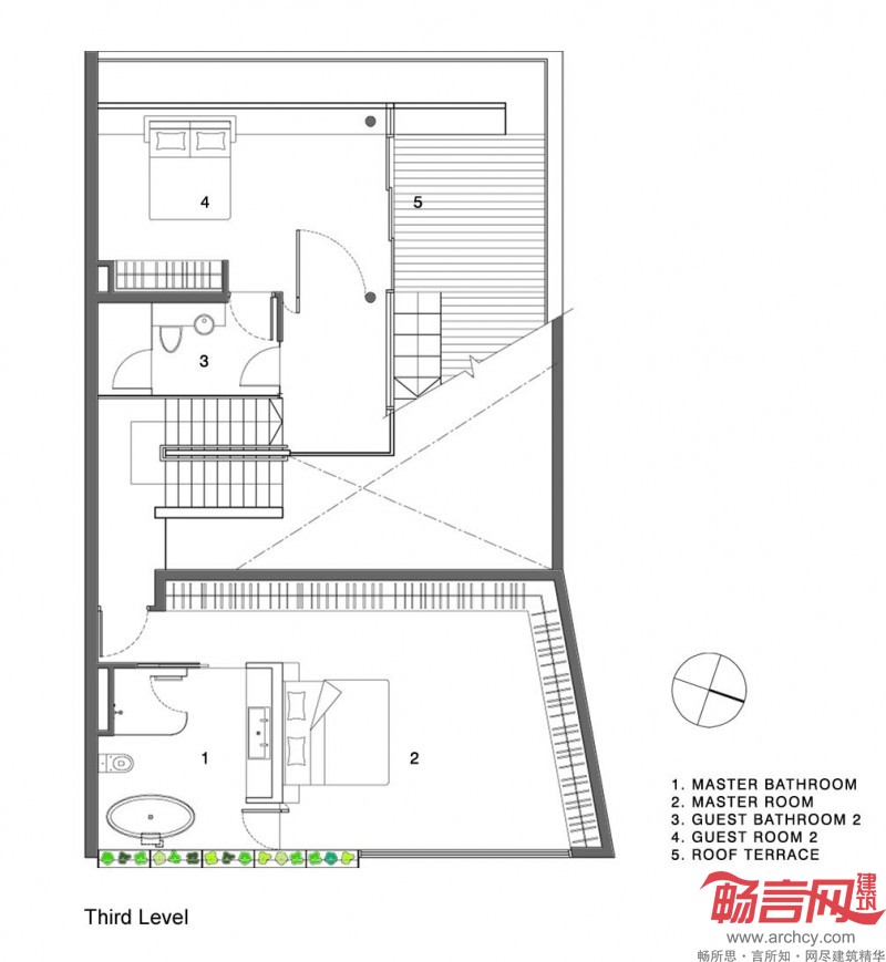 由于屋顶是错层结构,设计师通过屋顶斜坡将这些区域联系起来,同时也增强了室内空间与屋顶的连续性。业主在屋顶上还可以做露天烧烤,铺有马赛克的平台就可以当作餐桌使用。